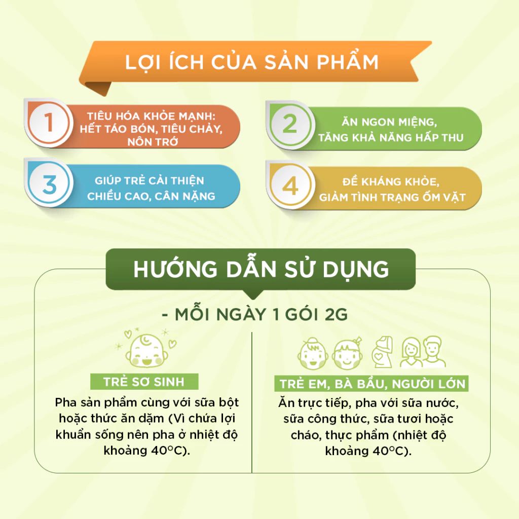 - Trẻ sơ sinh: Pha sản phẩm cùng với sữa bột hoặc thức ăn dặm (Vì chứa lợi khuẩn sống nên pha ở nhiệt độ khoảng 40-50 độ C)